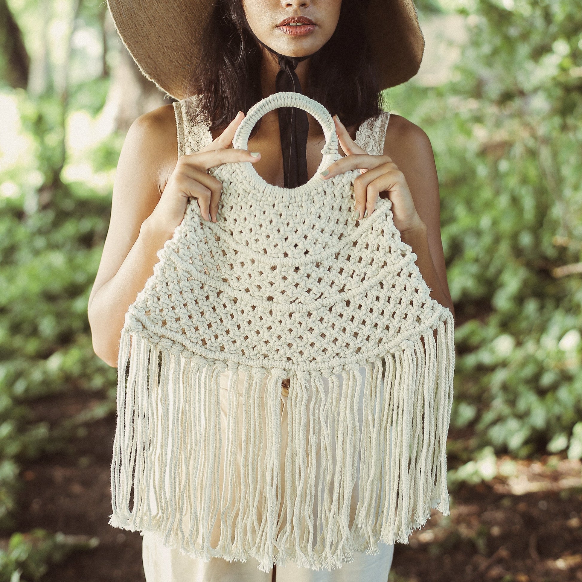 Irresistible?handwoven macrame bag with unique?fan shape and long fringe details. Made for perfect outings at the beach or countryside. Spacious to carry your summer vizor or your favorite tumbler (and plenty of hand ).